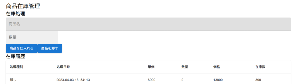 ではあたらめて実行し、商品在庫管理画面を見てみましょう。