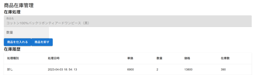 }この状態で「商品在庫管理」のページを開くと以下のように表示されるはずです。