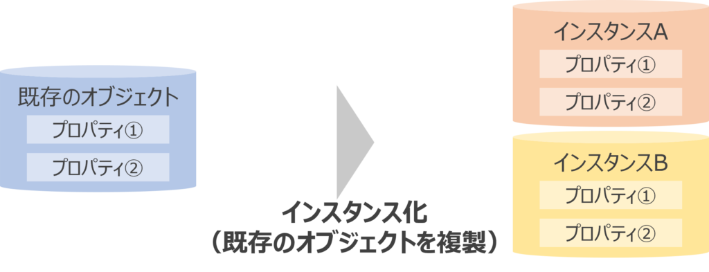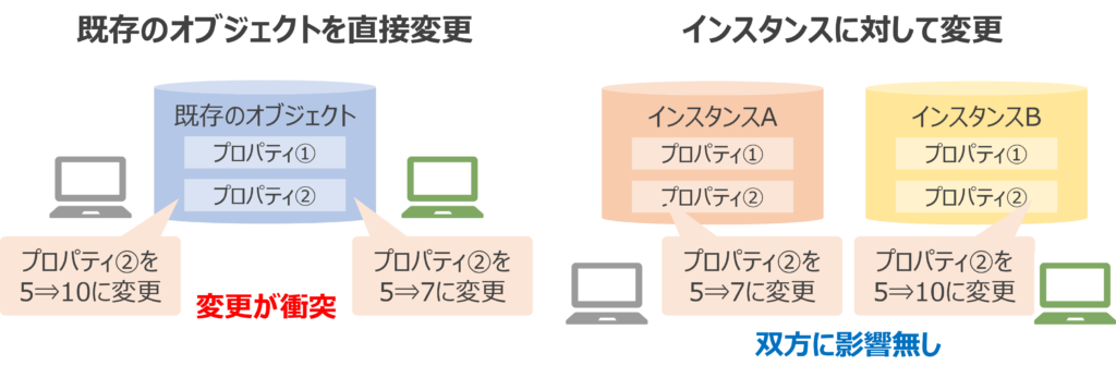 このように、既存のオブジェクトは触らず、インスタンスを操作することでデータの衝突を防ぐためインスタンス化が必要になります。