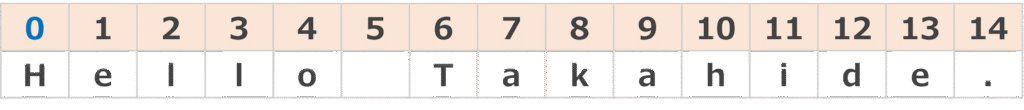 例えば先ほどの例でいくと、『Takahide』という文字列は『1』から数えた場合は『7番目』ですが、『0』から数えるため『6番目』となります。
