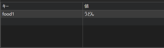 //実行結果:うどん『food1』キーに『うどん』という値が保存されていることが分かります。