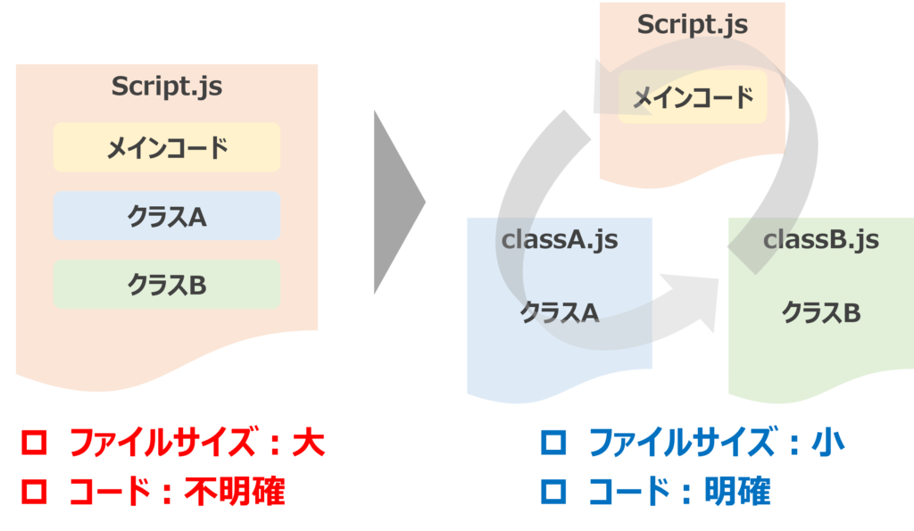 一方モジュールを使用した場合、右側の図のようにメインのJavaScriptファイルに「メインコード」・classAのJavaScriptファイルに「クラスA」・classBのJavaScriptファイルに「クラスB」という形でそれぞれの機能ごとに分割して記載することができます。