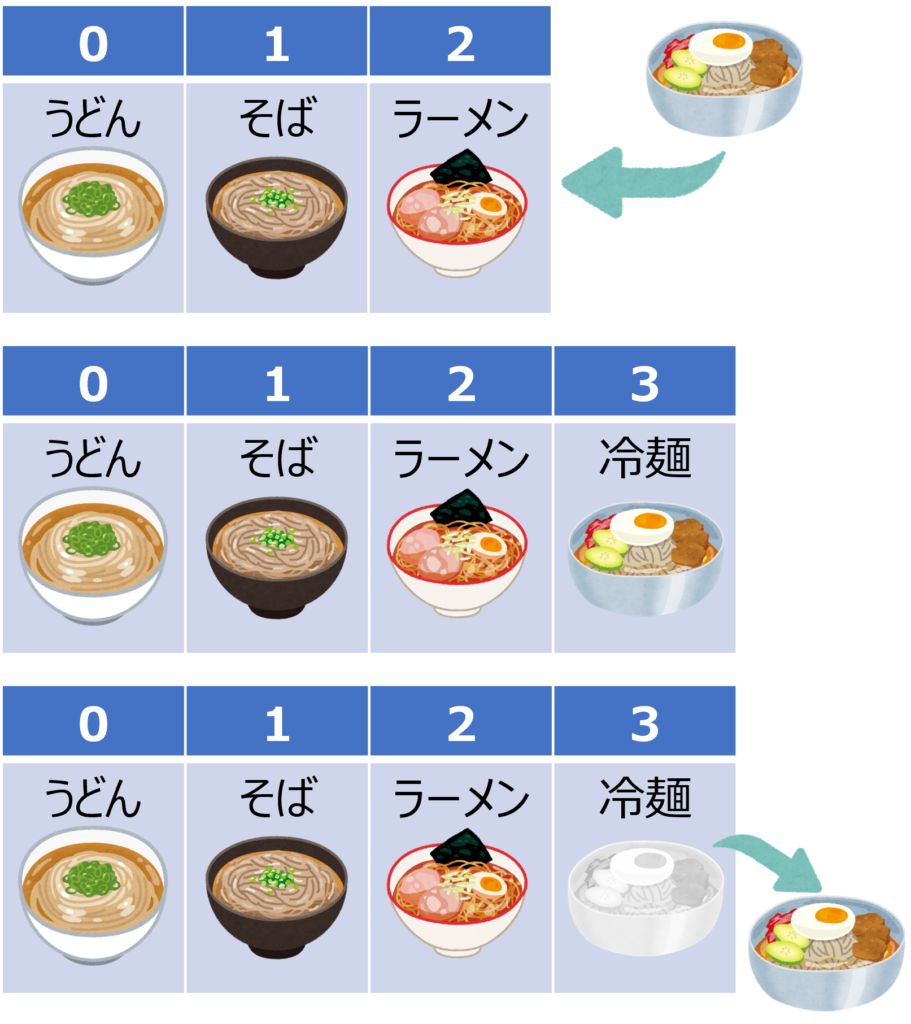//実行結果:(5) ['そうめん', 'うどん', 'そば', 'ラーメン', '冷麺']元々『うどん』『そば』『ラーメン』の3つの要素しかありませんでしたが、先頭に『そうめん』、末尾に『冷麺』を追加した5つの要素になっていることが分かります。
