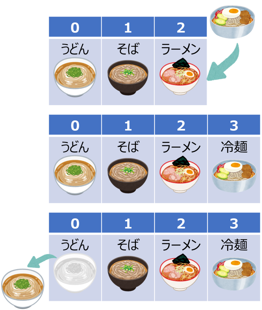 新たな要素「冷麺」を、配列の後に入れ、それを先に取り出します。