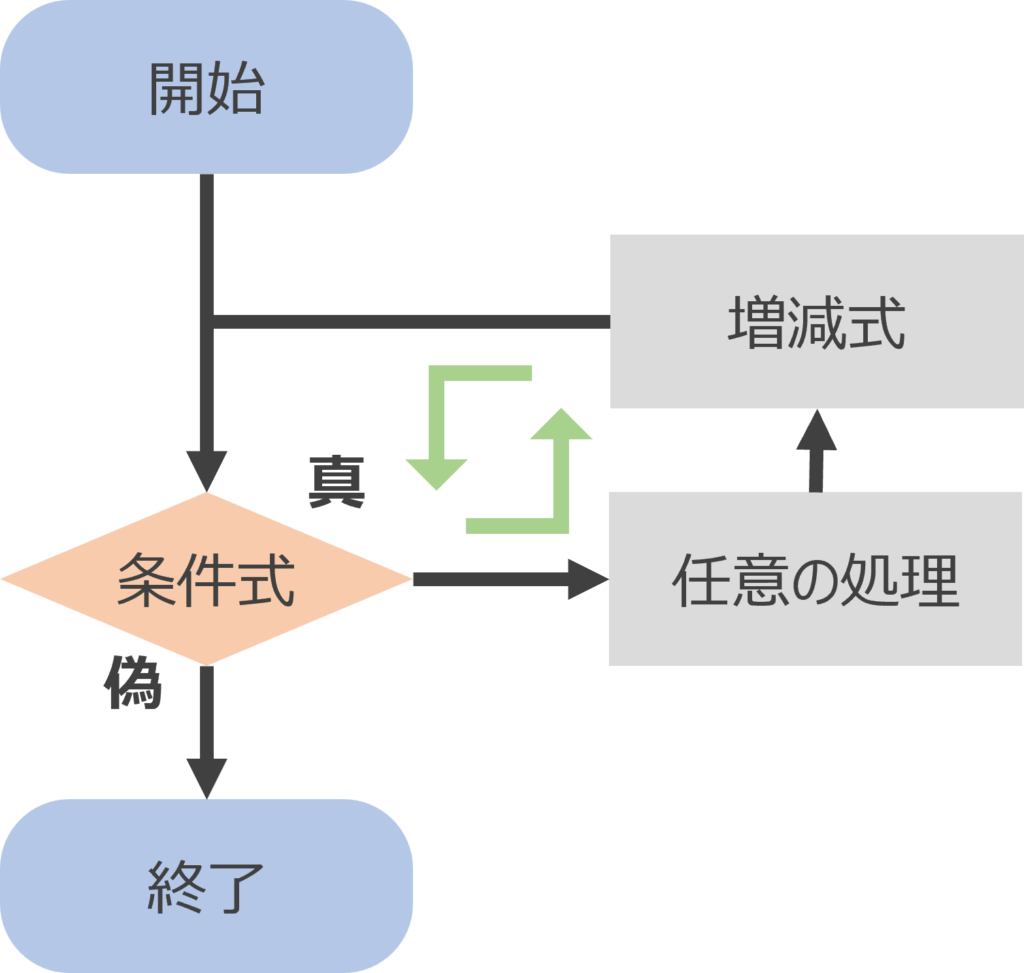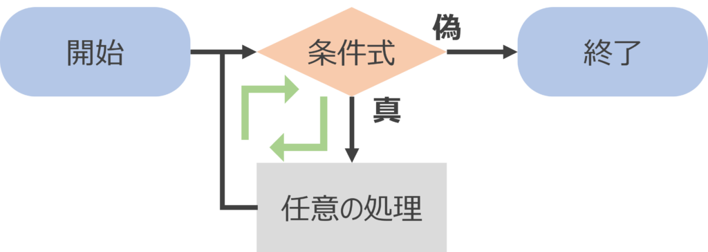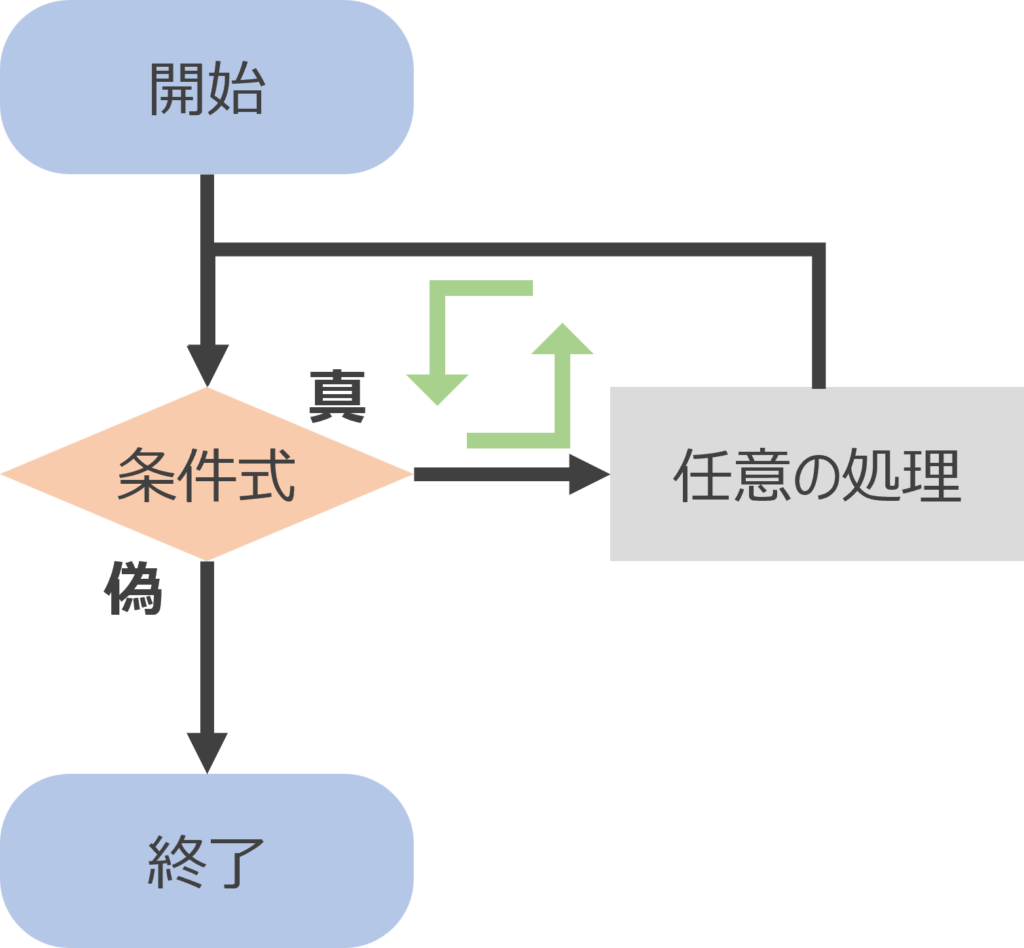 与えられた条件式が「真(true)」である間、繰り返し処理を実行します。