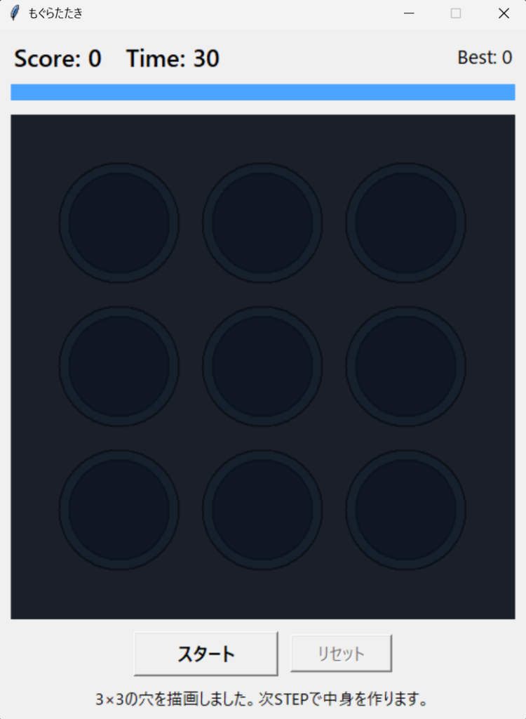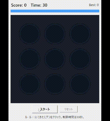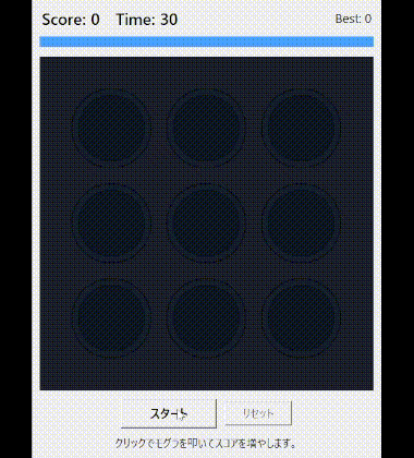 この段階で、スタートを押すとモグラが出現し、クリックでスコアが増えます。