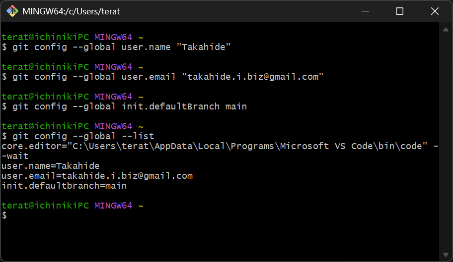 git config --global init.defaultBranch main最後に「設定できたか確認」しておきましょう。