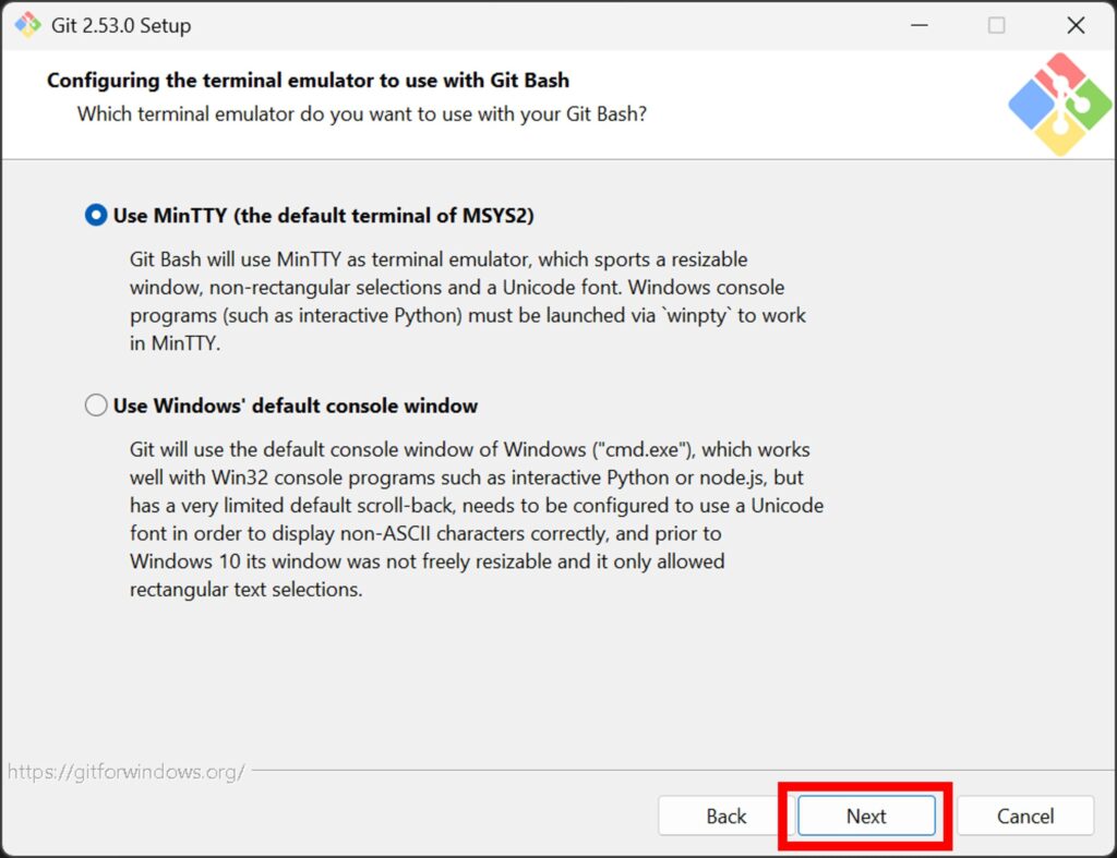 「Use MinTTY (the default terminal of MSYS2)」がオススメのようなのでそちらを選択して、「Next」を押下。