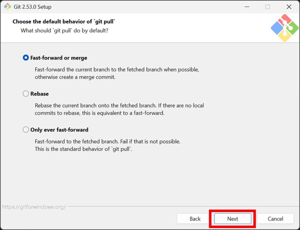 「Fast-forward or merge」で良いみたいなのでそのまま「Next」を押下。