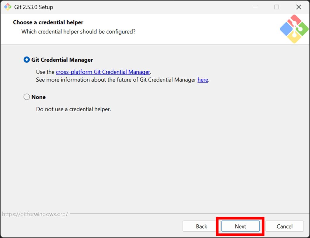 「Git Credential Manager」の方が良いみたいなのでこちらを選択して「Next」を押下。