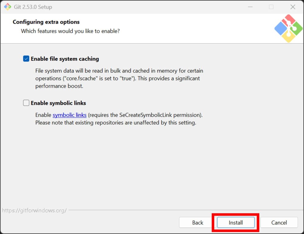 「Enable file system caching」のみ選択して「Install」を押下。
