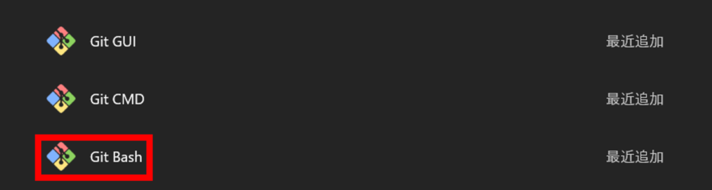 Gitのセットアップが完了すると、スタートメニューの中に以下のアプリが追加されていることを確認してください。