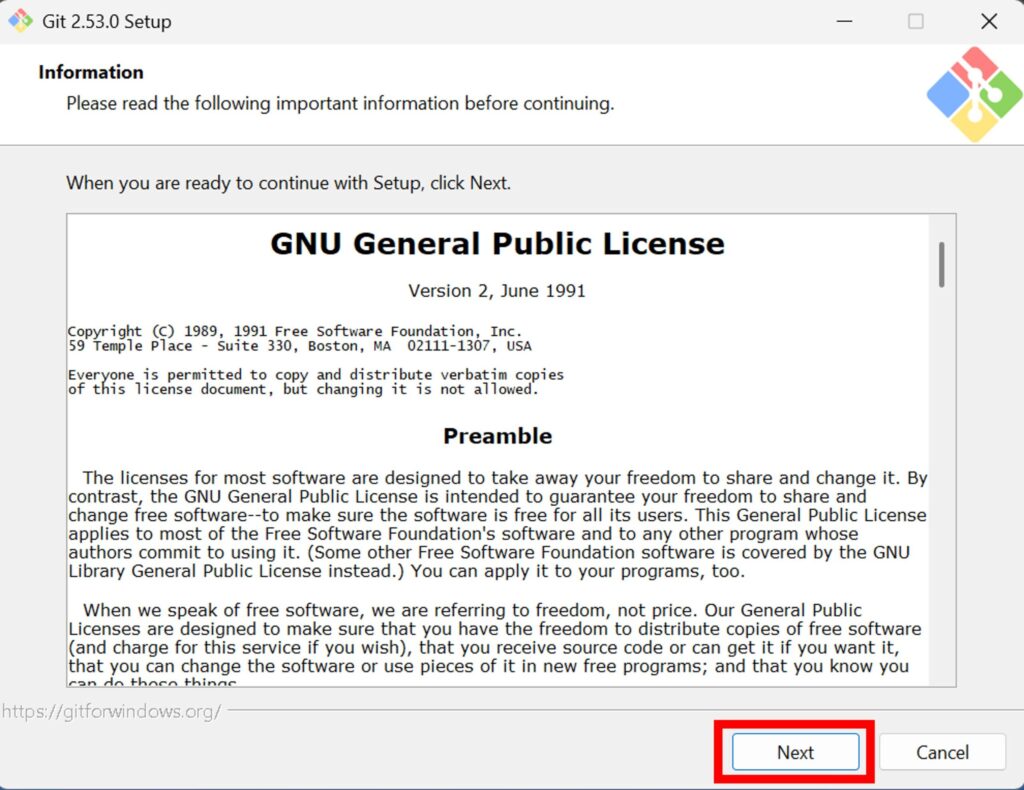 最初の画面では「GitをWindowsにインストールする前の注意点・前提条件」を確認しています。