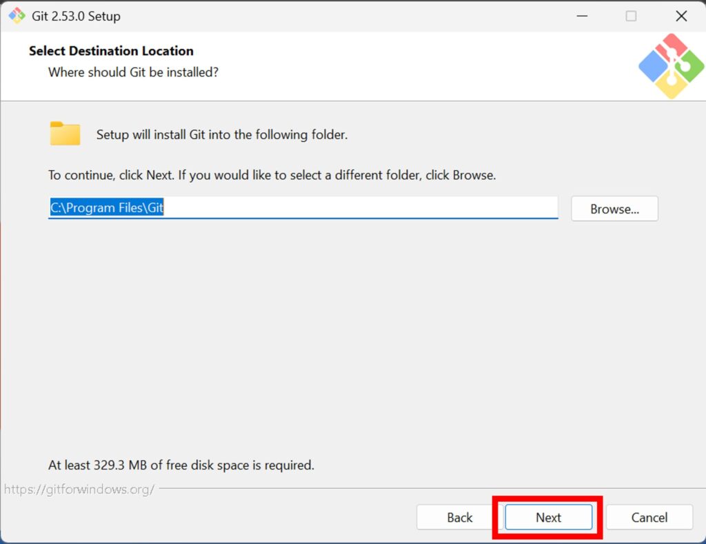 次に「Gitをどこにインストールするか」確認します。