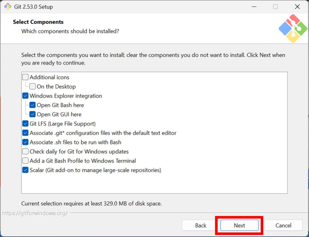 次に、「Gitと一緒にインストールする機能」を選択します。