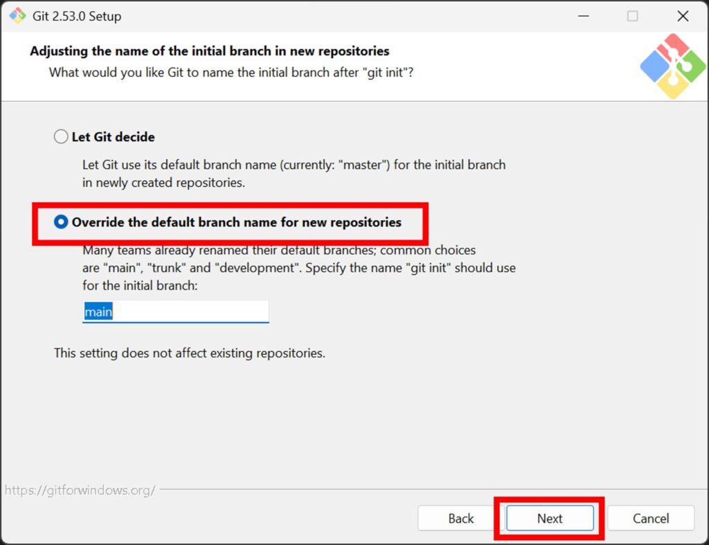 「Override the default branch name for new repositories」を選択して「Next」を押下。