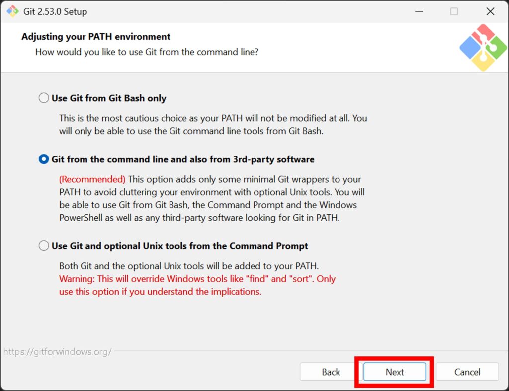 「Git from the command line and also from 3rd-party software」を選択して「Next」を押下。