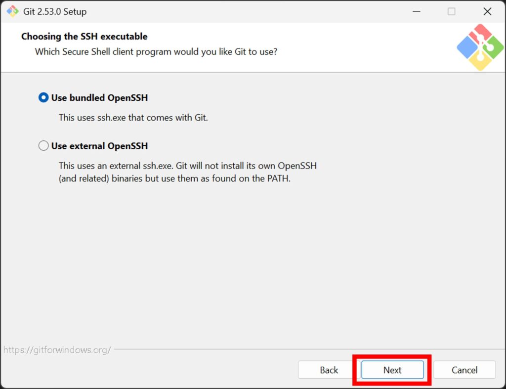 「Use bundled OpenSSH」を選択して「Next」を押下。