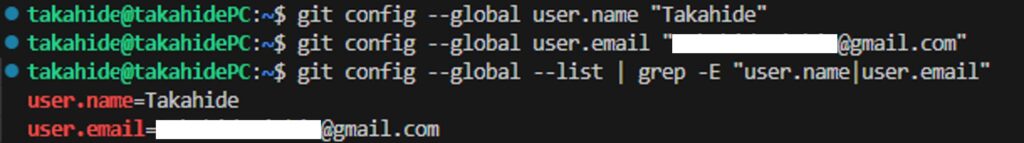 git config --global --list | grep -E "user.name|user.email"以下のように表示されればユーザ情報の設定完了です。