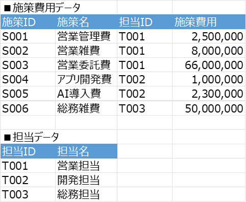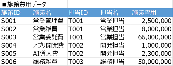 これでは「S006の施策IDで5,000万円使っているのがどこの担当か」が一目で分かりません。
